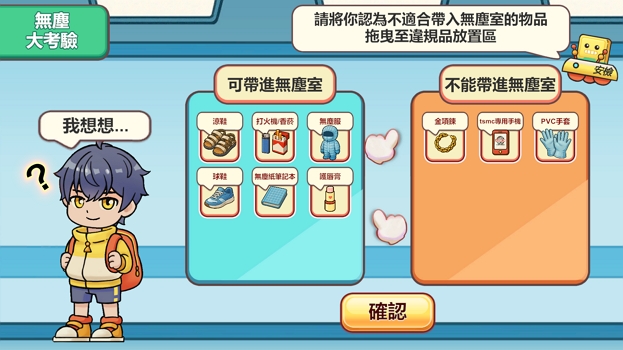 2025是一款多點觸控互動教育遊戲,目的在於教育操作者認識「哪些物品可以帶進無塵室、哪些不可以」,並培養正確的分類與判斷能力。