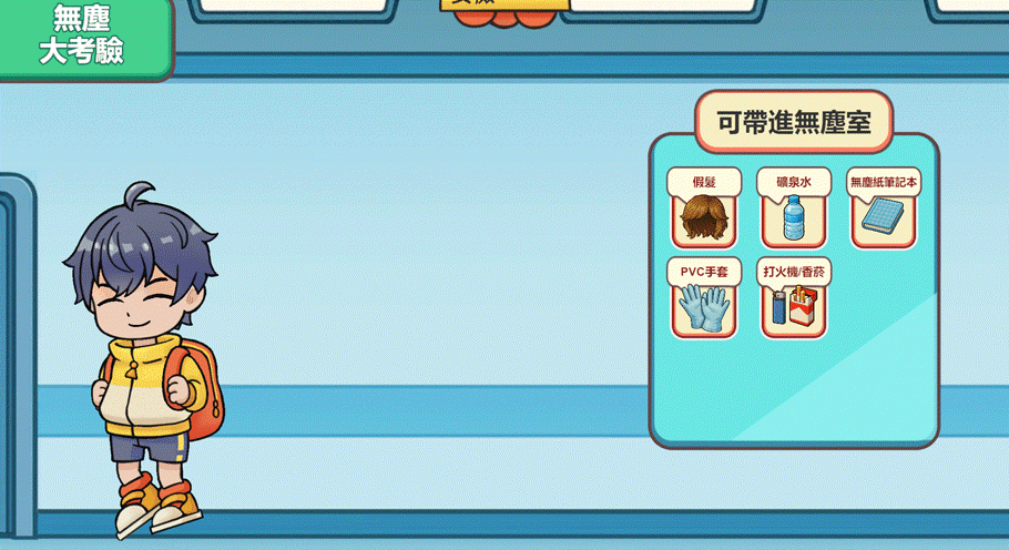 完成分類後,系統會顯示正確答案,清楚標示各項物品是否判斷正確,並同步提供對應的說明內容,讓玩家了解該物品是否可攜帶進入無塵室及其原因。透過「先作答、再學習」的設計,加深對無塵室規範的理解與記憶。